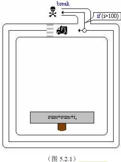 这段代码的意思是,当i<=100的时候一直执行循环;一旦i>100了,则会运行到if语句里的break语句,于是强行中止了循环。以上这段代码可以由图5.2.1来表示。我们也不难发现,修改后的程序运行结果应该和程序5.1.1的运行结果一样。那么,进维修站又是怎么一回事呢?