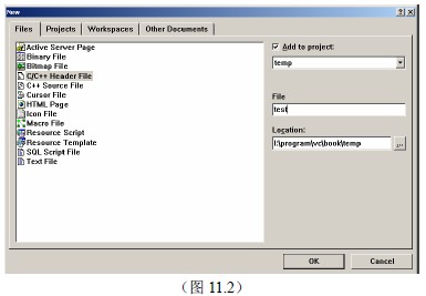 在第二章中,我们看到一个C++的工程里面除了源文件还有头文件。根据以下步骤便能创建一个头文件:首先要创建或打开一个工程,然后按File菜单中的new。在出现的对话框左边选择C/C++ Header File,在对话框右边的File一栏里填上头文件名,最后点击OK。如下图11.2所示: