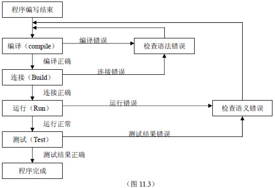 调试主要分四个步骤和两种处理方式。我们把程序的编译和连接统称为编译阶段,把程序的运行和测试统称为运行阶段。在编译阶段发生的错误称为编译错误(Compile Error),在运行阶段发生的错误称为运行时错误(Runtime Error)。对于编译错误,我们通过检查并修正语法错误来解决;对于运行时错误,我们通过检查并修正语意(程序设计思想)错误来解决。