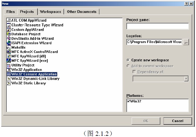 左面部分是提供工程类型的选择,即我们要设计何种类型的程序。我们要学习的是控制台应用程序,所以选择Win32 Console Application(如图)。右边的Project Name为工程名,应该不难理解。而Location则是工程保存的位置,如果你对保存位置这个概念还不清楚,那么请查阅一些初学者的参考书。要说明的是,当在Location下新建一个工程后,会在Location这个位置下新建一个以工程名命名的文件夹。而通过打开这个文件夹中的“工程名.dsw”文件可以打开该工程。
