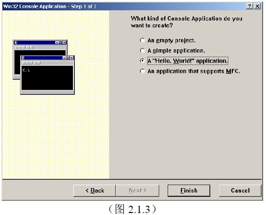 该对话框问我们要创建哪种控制台应用程序,我们要创建一个“Hello,World!”的示例程序,所以我们选第三项(如图)——A “Hello,World!” application。(思考:如果我们要自己编一个控制台应用程序,我们应该选哪个?)
