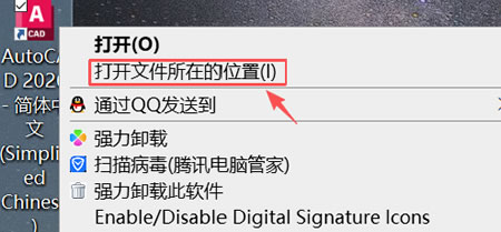 11) 在桌面上右键 AutoCAD ,点击 “打开文件所在位置”: