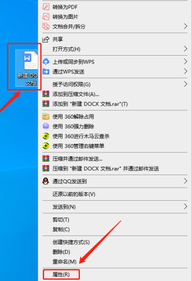 在电脑中找到要打开的文档,对其点击鼠标右键,在出现的菜单中选择最底下的一项“属性”,然后进入到属性设置面板中。