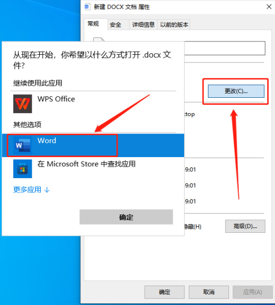 属性设置中的打开方式项后面有一个“更改”按钮,单击后会弹出相关打开方式的弹窗,这里我们选择“Word”,最后点击下方的“确定”,之后此类的文件默认打开方式就都是office软件了。