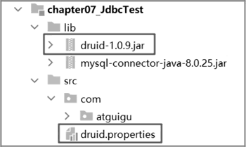 例如,在 chapter07_JdbcTest 项目中,引入 Druid 的依赖包,并创建 druid.properties 文件设置数据库信息。目录结构如下图所示: