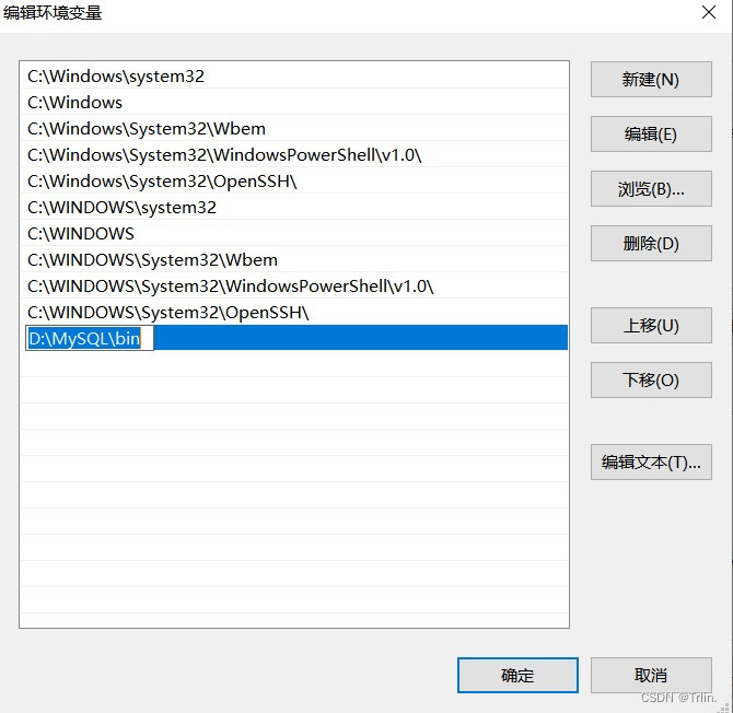 4.点击“新建”后,将Mysql的路径复制粘贴上去,之后点击“确定”。