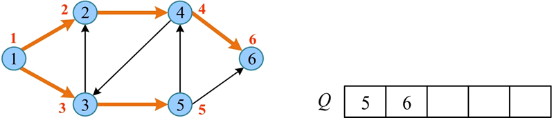 7) 将队头元素 5 出队,5 的邻接点 4、6 均已被访问,没有未被访问的邻接点。