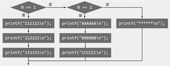 在上文的示例代码中,无论表达式 N == 1 结果为真或假,后三条函数 printf() 调用都不受影响。但是使用 #else 指令后,它与 #endif 指令将后三条函数 printf() 组成指令块。仅当 N == 1 结果为假时,后三条函数 printf() 调用语句才得以保留,如下图所示: