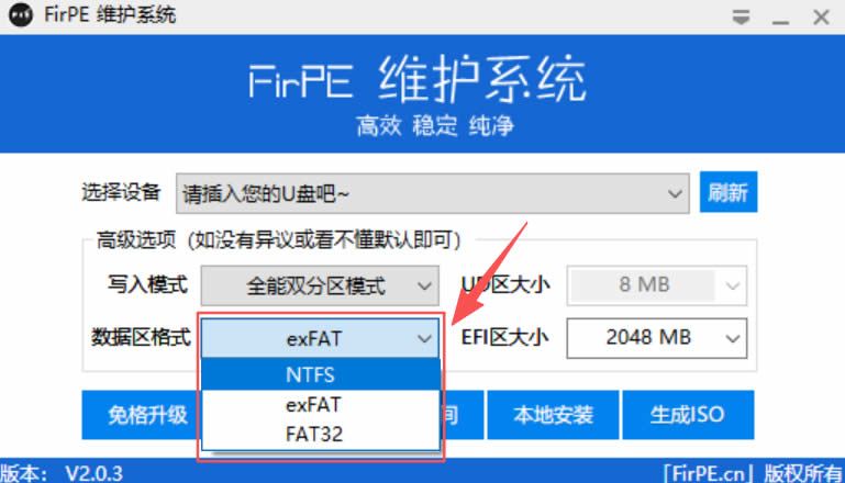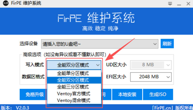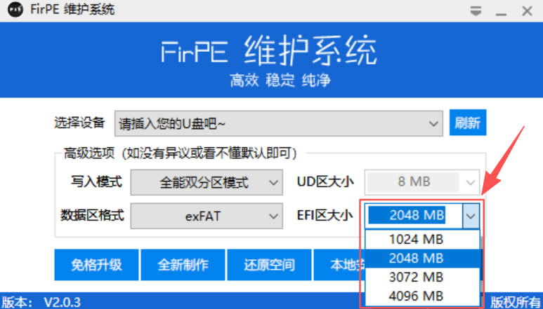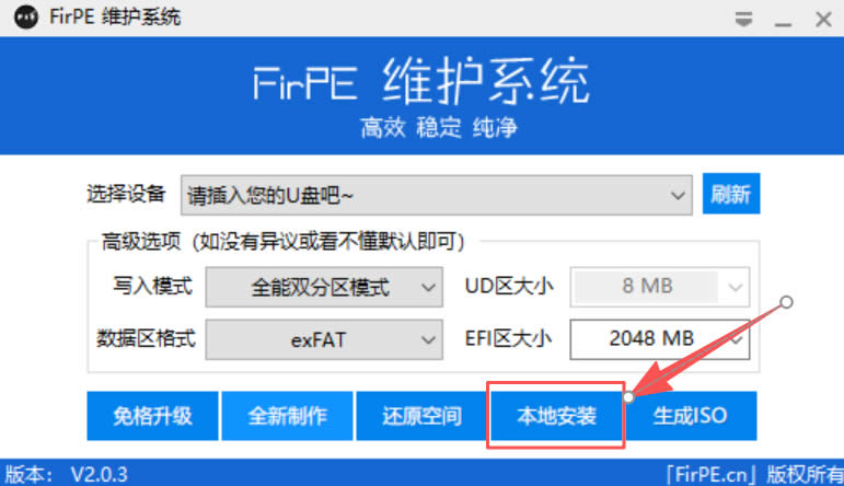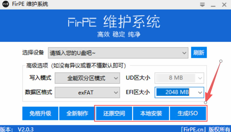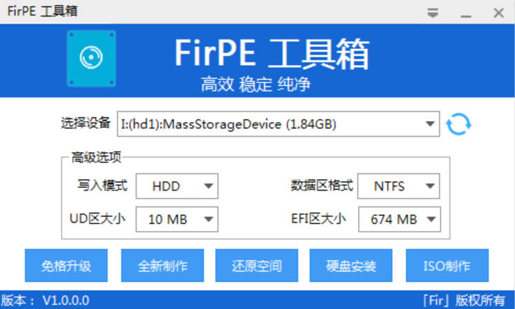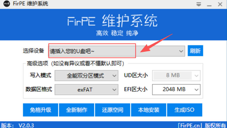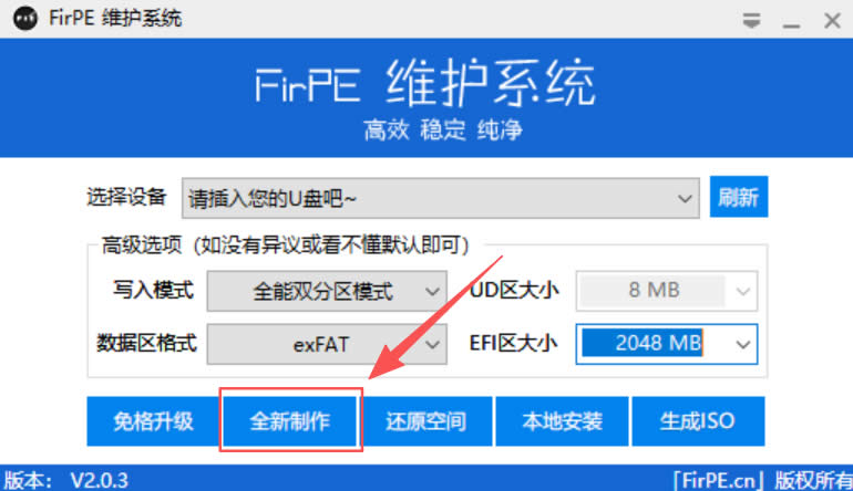 1、打开 FirPE,然后插入 U 盘进行 PE 制作: