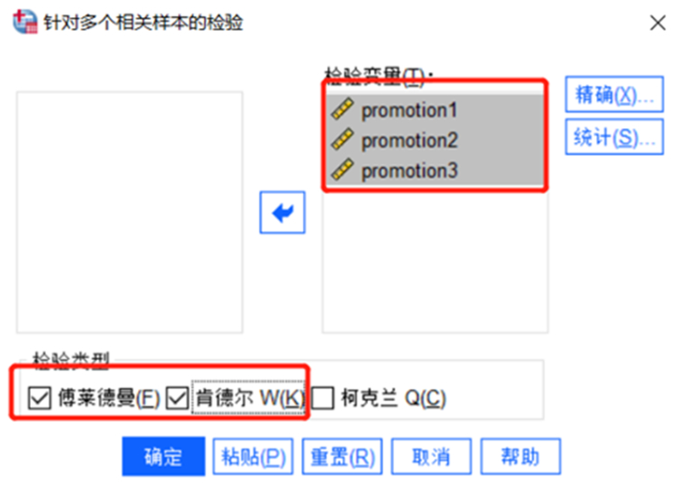 1、点击SPSS顶部菜单栏“非参数检验”-“旧对话框”-“k个相关样本检验”,即可打开针对多个相关样本的检验窗口。将三个促销变量加载到检验变量文本框,并且检验类型勾选“傅莱德曼”、“肯德尔”选项框。