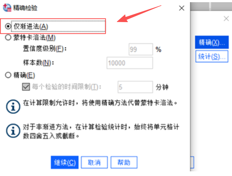 2、点击多样本相关检验右侧“精确”按钮,保持默认的仅渐进法。同理统计保持默认设置即可。