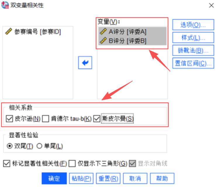1、点击SPSS顶部菜单栏“分析”-“相关”-“双变量”。将评委A、B加载到变量文本框,并且相关系数勾选“皮尔逊”和“斯皮尔曼”。