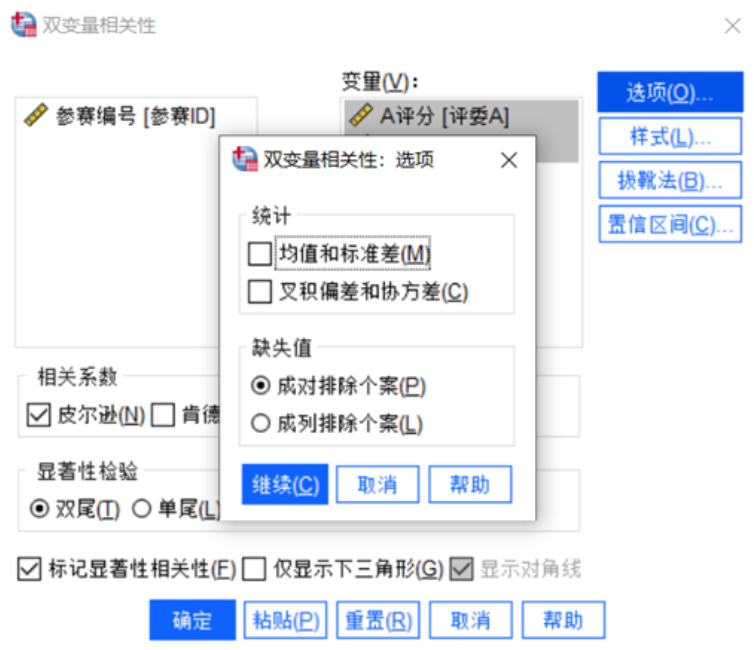 2、双变量相关窗口左侧“选项”、“样式”、“拔靴法”、“置信区间”均保持默认,当然可以根据个人需要进行勾选。