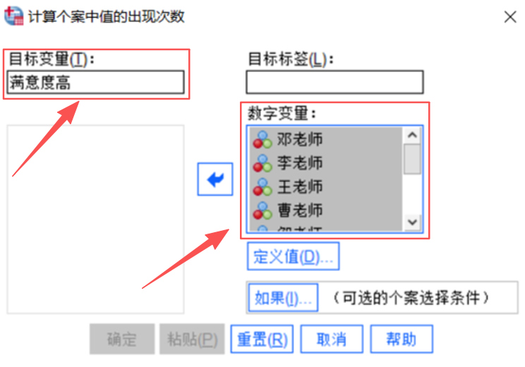 1、点击SPSS顶部菜单栏“转换”-“对个案中的值进行计数”。目标变量设置为:满意度高,并且将10个老师变量加载到变量文本框。