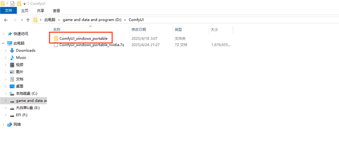 下载网盘里的 ComfyUI_windows_portable_nvidia.7z 压缩包,解压之后会得到下图的文件夹: