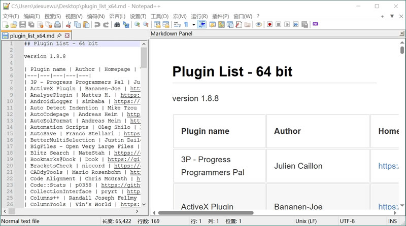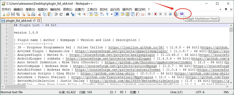3) 重启 Notepad++,找到下载的 md 文件并用 Notepad++ 打开,然后在下图标注的位置找到 Markdown Panel 并点击:
