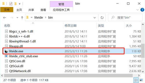 2) 进入 bin 文件夹,找到 liteide.exe,如下图所示: