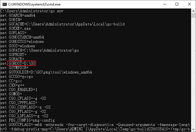 如果记不清了也没关系,可以在 CMD 窗口中使用 go env 命令查看 GOROOT 对应的值。