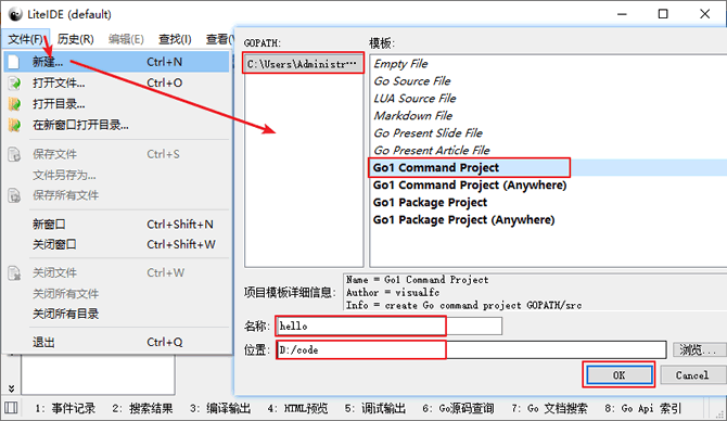 在“文件”菜单中选择“新建”,在弹出的窗口中,选择系统默认的 GOPATH 路径,模板选择“Go1 Command Project”,最后填写项目名称,并选择合适的目录,确认无误后点击“OK”。