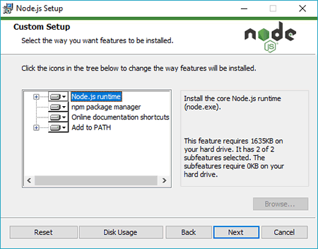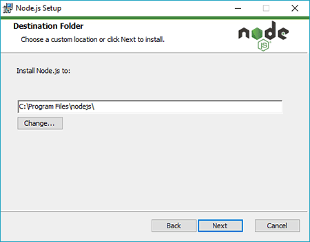 3) Node.js默认安装目录为 "C:\Program Files\nodejs\" , 建议安装到非系统盘,并点击 Next 按钮: