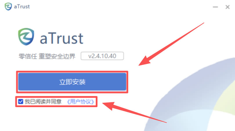 1)下载文件夹内名为“aTrust.exe”的安装包。2)勾选“我已阅读并同意《用户协议》”,点击“立即安装”: