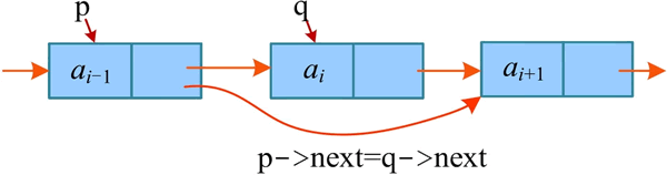 其中,“p->next=q->next”表示将 q 的下一个节点的地址赋值给 p 的指针域。