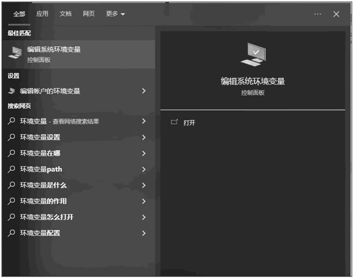 1) 在计算机的左下角搜索“环境变量”,如下图所示,选择“编辑系统环境变量”,单击“打开”选项。