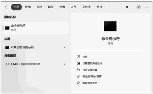 5) 配置安装 Apache 的主服务器,在计算机左下角搜索 CMD,单击“以管理员身份运行”选项(务必使用管理员模式打开命令提示符),如下图所示。