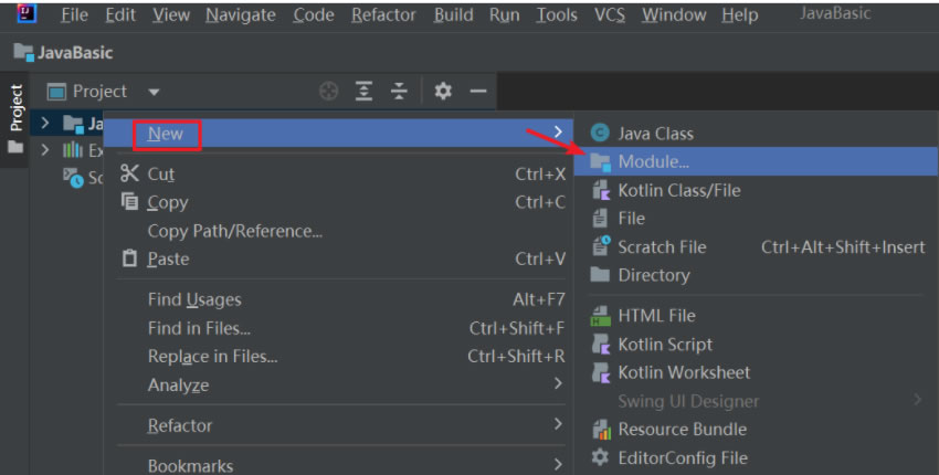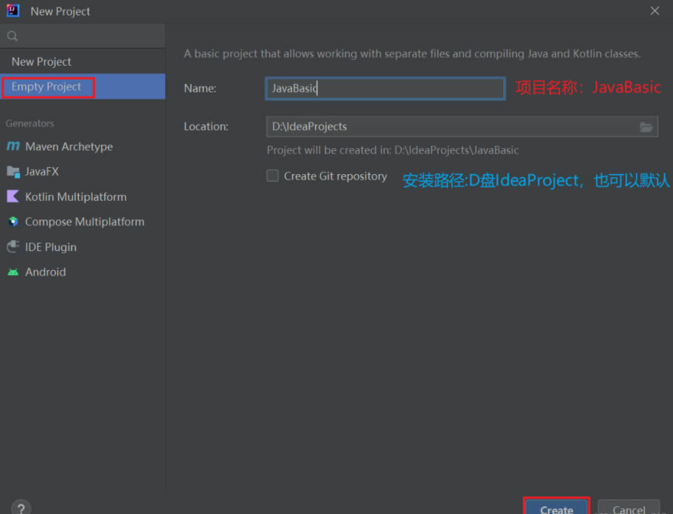 选择New Project这里选择创建一个空的项目名为JavaBasic,最后点击创建即可