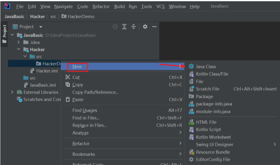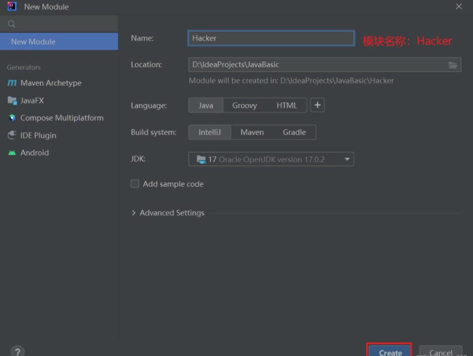 右键项目创建一个模块名为Hacker