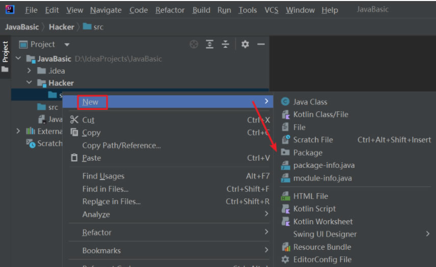 右键模块名下面的src文件夹创建一个包名为HackerDemo: