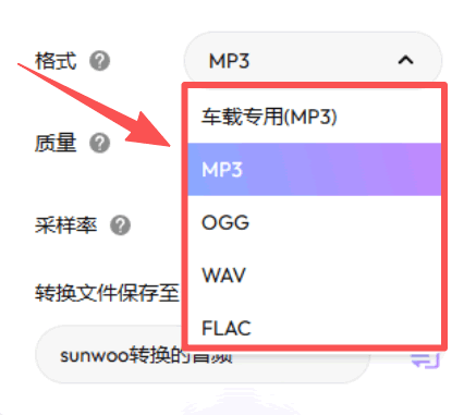 选择音频输出格式,音频转换格式有多种,点击格式右边的下拉按钮即可选择输出的格式。