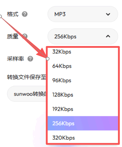 选择音频输出质量,点击质量右边的下拉按钮,即可选择输出音频的质量。