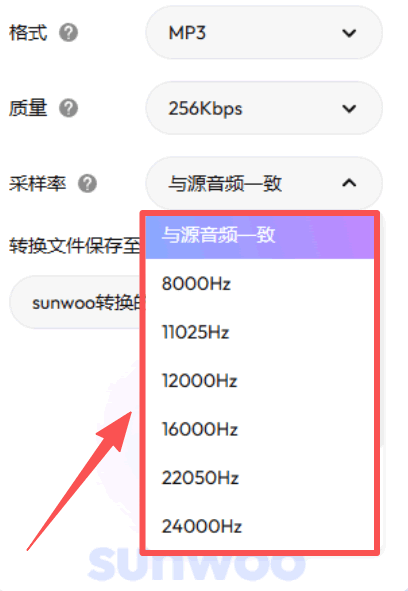 选择音频的采样率,点击采样率右边的下拉按钮,即可选择采样率。