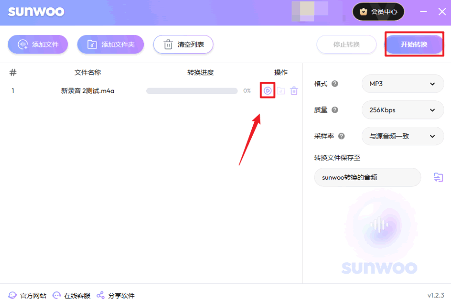点击软件右上角的开始转换或者文件右边的三角按钮即可转换音频格式。