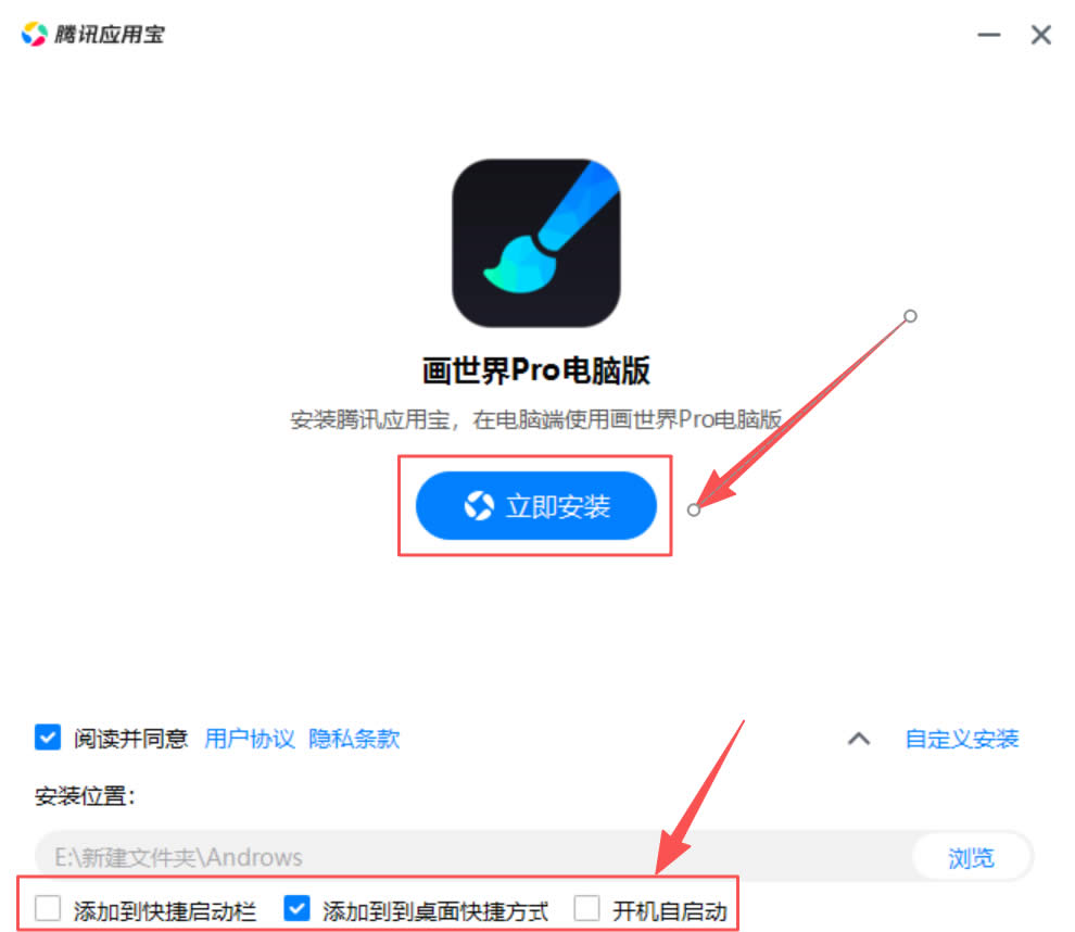4)是否“添加到快速启动栏”和“开机自启动”可自己定义,个人建议取消,然后点击“立即安装”: