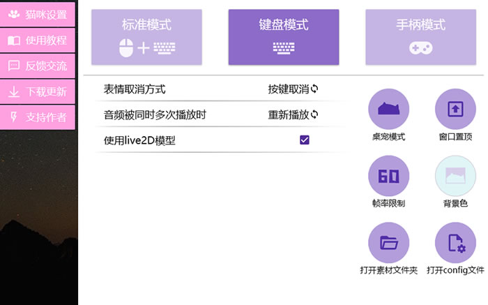 BongoCat 支持多模式交互,提供键鼠、纯键盘、手柄及绘画数位笔四种模式,适配主流游戏手柄和数位设备。BongoCat 支持透明无边框窗口,可通过快捷键拖拽调整大小与位置,鼠标还能穿透窗口操作其他程序,不遮挡工作界面。