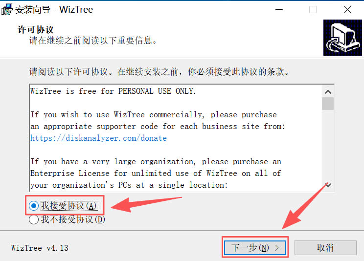3)手动勾选“我接受协议”,然后点击“下一步”: