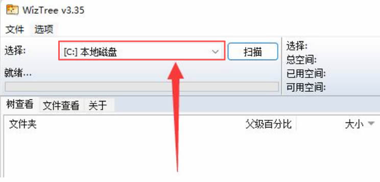 1、打开 WizTree,在上方可以选择扫描的磁盘。
