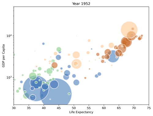 上述代码从 CSV 文件中读取数据,并绘制了 1952 年各国的人均 GDP 与预期寿命的散点图。气泡的大小代表人口数量,颜色代表所属大洲。通过设置对数尺度的Y轴,使数据更易于观察。输出的结果如下图所示。