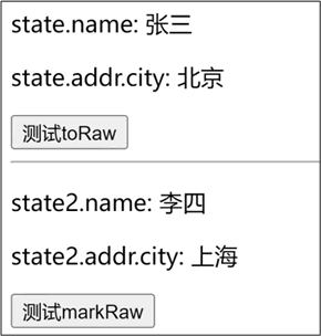下面通过代码来演示 toRaw() 与 markRaw() 函数的使用方法: