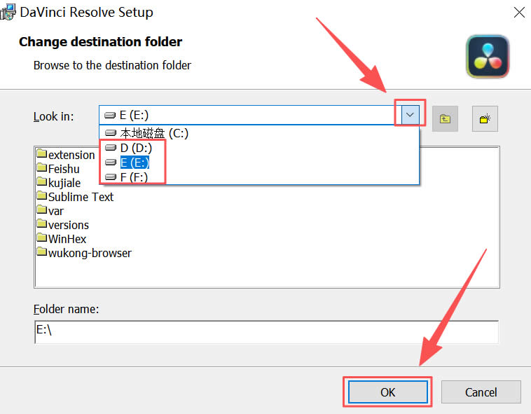 8)先点击下拉三角,展开后选择任意一个非系统盘,然后选择安装到那个文件夹,再点击“OK”:
