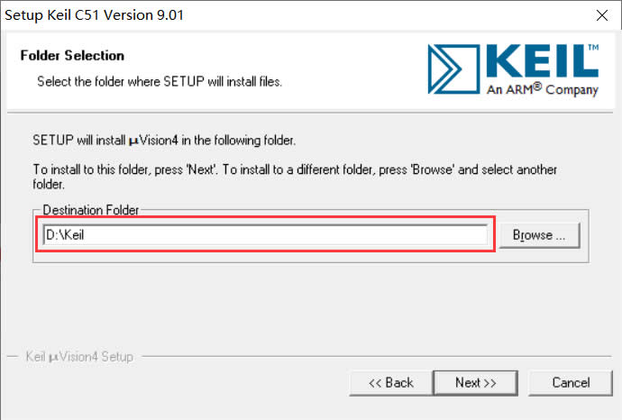 这里一开始会默认安装在C盘,因为C盘是系统盘,所以不建议将Keil4安装在系统盘里面,一般就将“C”改成“D”或者“E”都行(前提是你的电脑有D盘或者E盘)。另外需要说明的一点是,安装路径尽量不要出现中文或者特殊字符,不然后面使用软件的时候可能会报错。路径选择好后就点击“Next”。