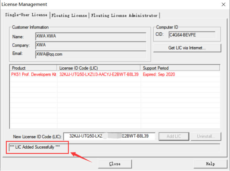将生成的一串代码复制到“Licence Management”中的New Licence ID Code(LIC),然后点击后面的“Add LIC”即可,如图17所示。看到下面提示“LIC Added Successfull”说明破解成功,如图18所示。