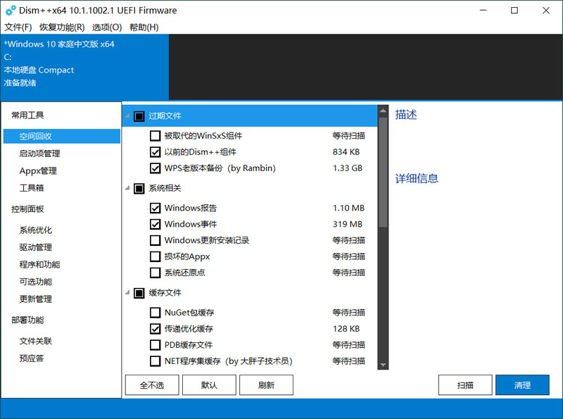 1) Dism++ 提供了很多待回收选项,默认只勾选了一些,剩下的大家可以根据自身情况选择。注意,勾选某些选项会弹出警告,这些要额外小心,除非明确要清理,否则不建议勾选: