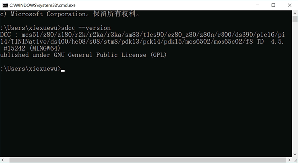 安装后,打开 cmd,输入 sdcc --version 可以看到版本信息,证明安装成功: