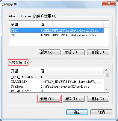 (2) 从弹出的“环境变量”对话框中单击“系统变量”列表框下方的“新建”按钮,如下图所示。