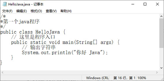 Java 源程序可以使用任何一个文本编辑器来编写,这里以 Windows 下的记事本为例。(1) 新建一个空白记事本,然后如实地输入下列内容。 很多初学者可能不明白此程序的全部意义,没关系,请完全按照实例的样式输入,包括各种括号与标点符号。