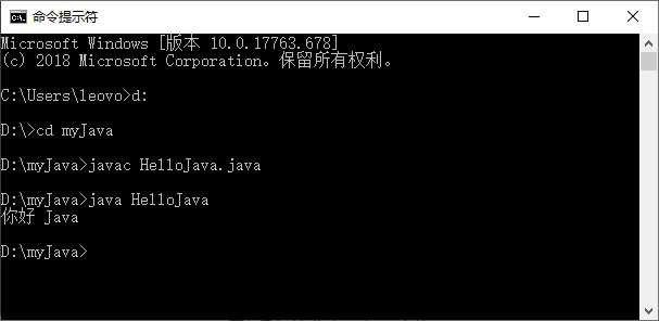 - 输入 java HelloJava 命令执行程序,如果出现“你好 Java”字符,说明程序执行成功。