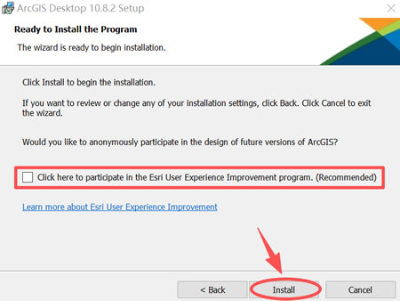 15) 取消勾选 “Click here to participate in the Esri User Experience Improvement program.(Recommended)”,点击 “Install”: